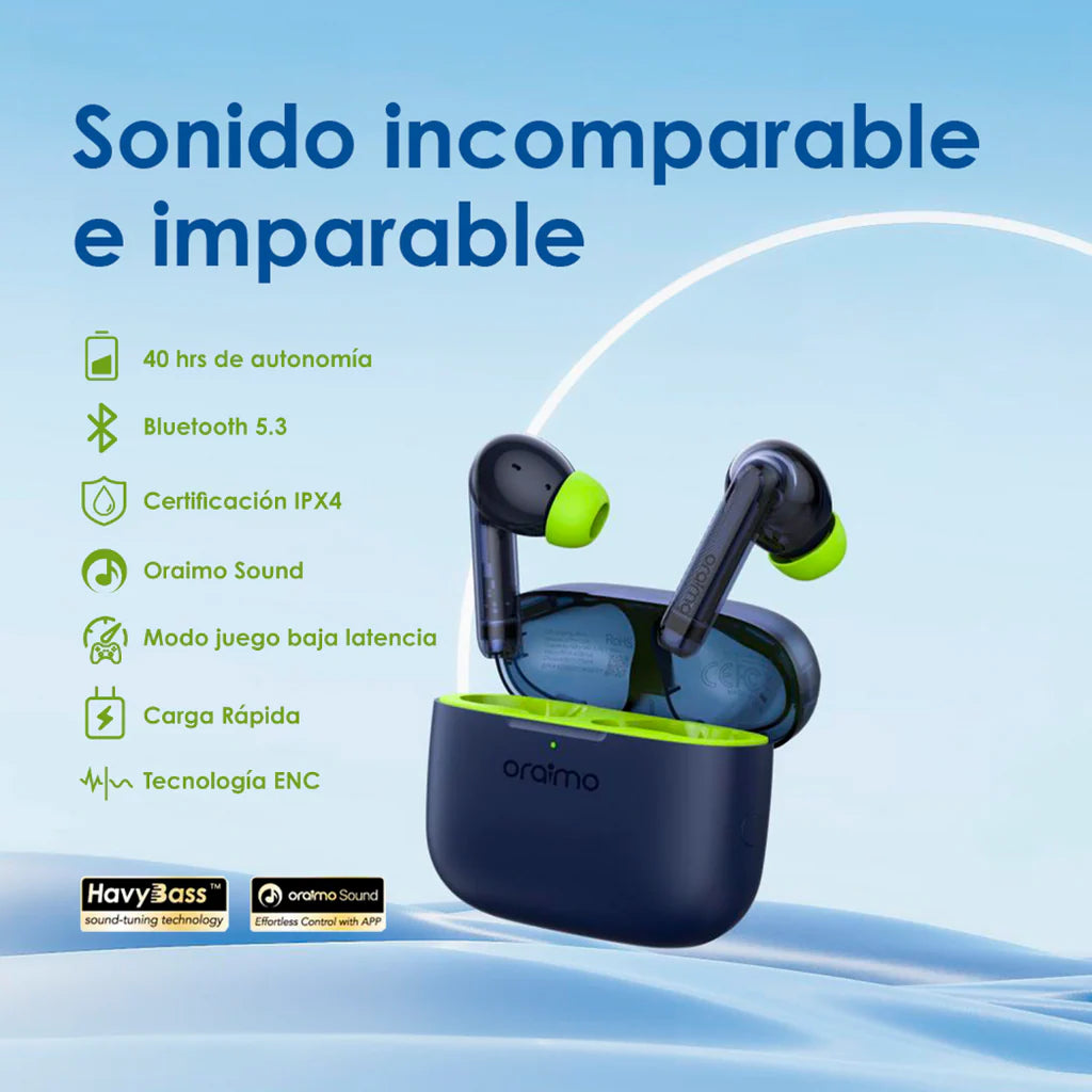 Los Oraimo FreePods Lite OTW-330 son audífonos inalámbricos de alto rendimiento, diseñados para ofrecer sonido claro y conexión estable vía Bluetooth.