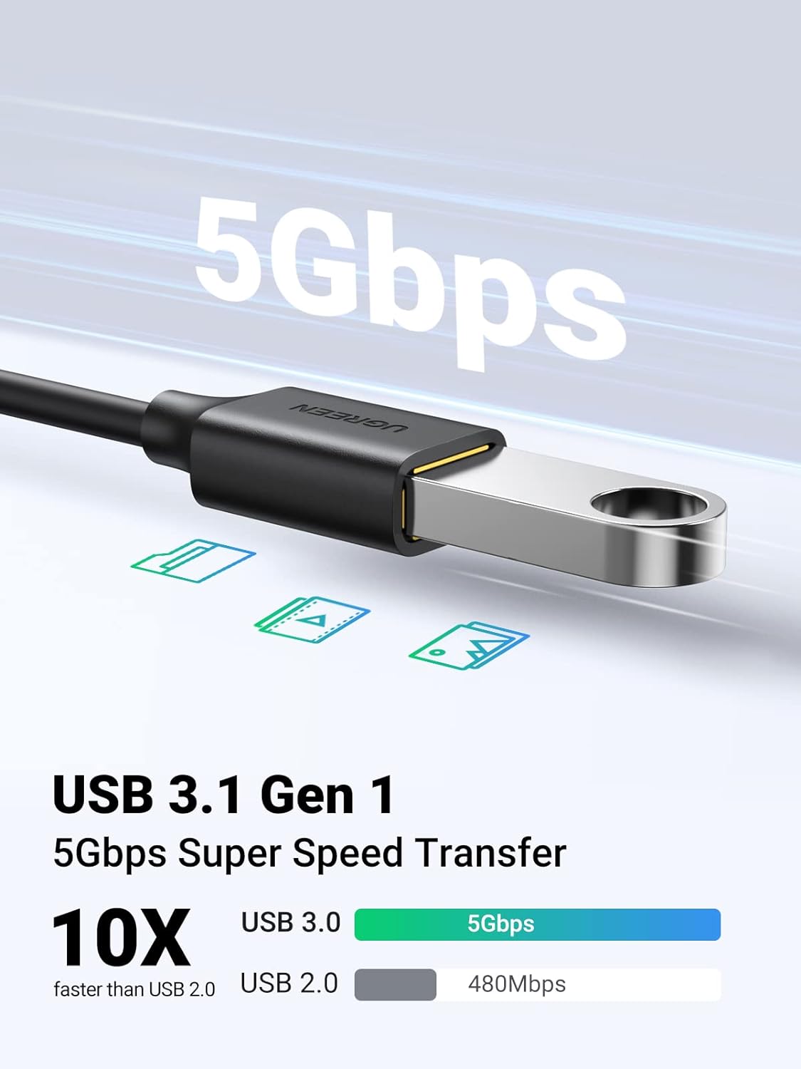 El Cable UGREEN US154 es una solución ideal para transferencias de datos y carga rápida. Gracias a su tecnología USB 3.0, alcanza velocidades de hasta 5 Gbps, permitiendo la transmisión eficiente de archivos entre dispositivos con puertos USB-C y USB-A.
