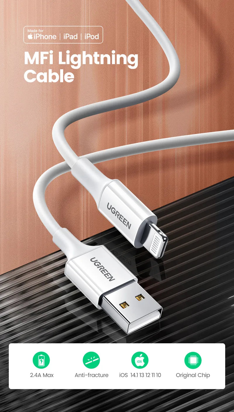El Cable UGREEN US155 USB-A a Lightning de 1.5 metros es la opción ideal para cargar y transferir datos en dispositivos Apple con puerto Lightning.