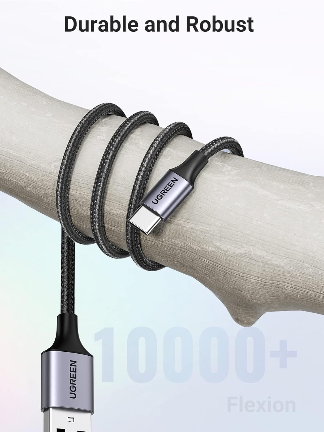 El Cable UGREEN US288 USB-A a USB-C de 1 metro ofrece carga rápida de hasta 3A y transferencia de datos eficiente, ideal para cargar y sincronizar smartphones, tablets y otros dispositivos USB-C.