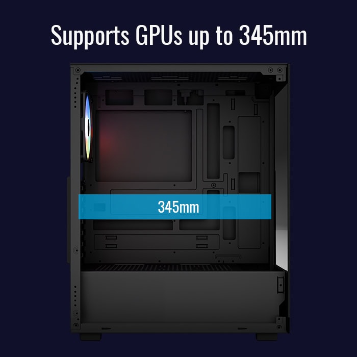 - Panel de vidrio templado: En el lateral y el frontal para una vista clara de tus componentes