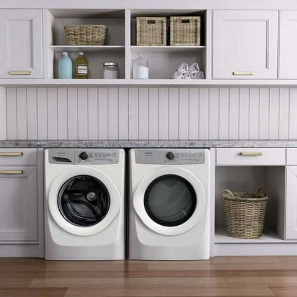 El diseño moderno en color blanco se adapta fácilmente a cualquier espacio de lavandería.