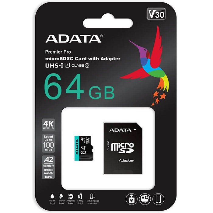 Memoria MicroSDXC ADATA Premier Pro | 64GB | Clase 10 | UHS-I U3 | V30 | A2 | 100/80 MB/s | Con Adaptador SD