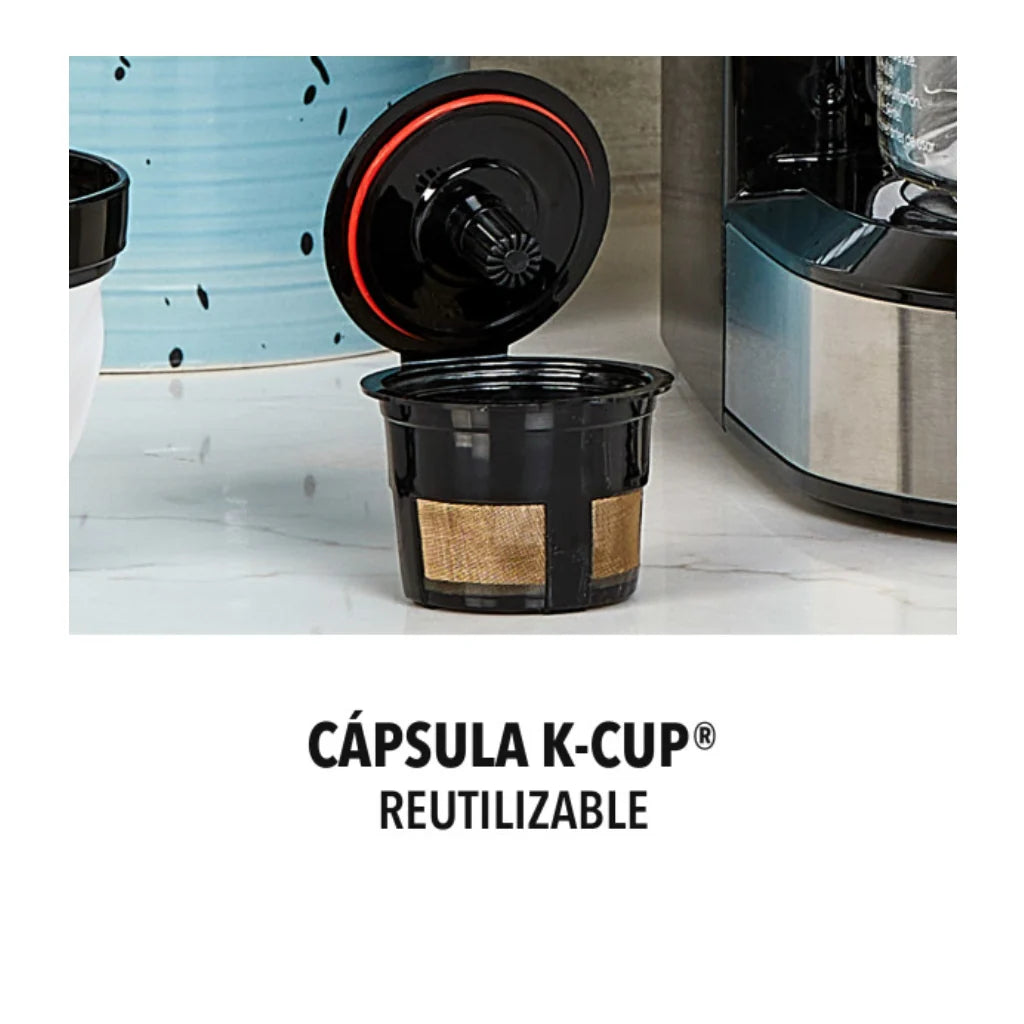 Es compatible con cápsulas K-Cup® y café molido, ya que incluye filtro reutilizable doble, brindándote mayor versatilidad en cada preparación. Además su tanque de agua extraíble de 2.1 litros facilita el llenado y la limpieza.