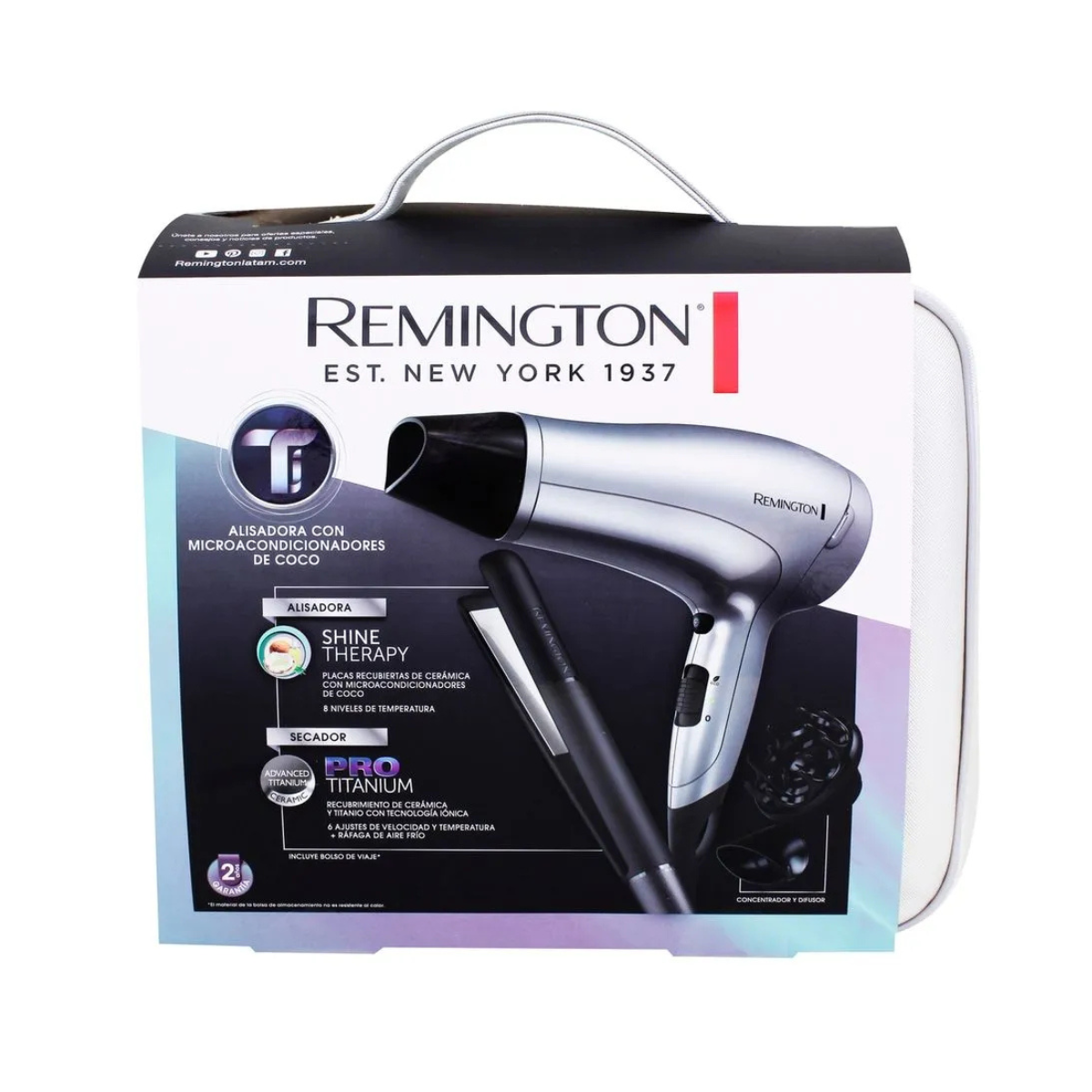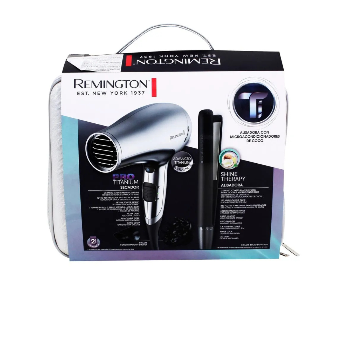 Combo Remington Secadora + Plancha de Cabello Titanium Shine Therph S4A500-D3019-F | Placas Cerámicas Avanzadas | Secadora 1875W | Aire Frío