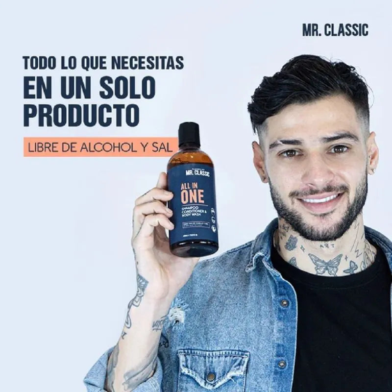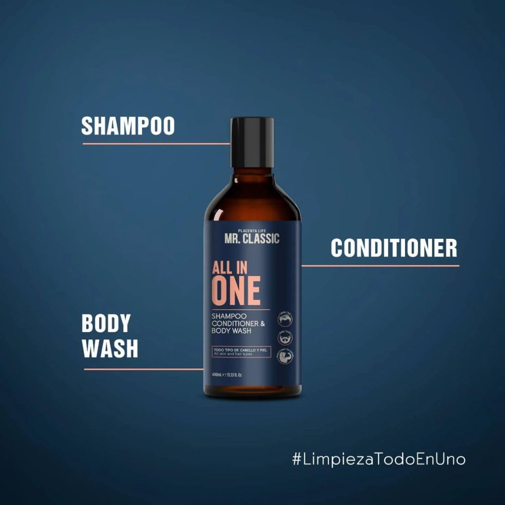 Shampoo All In One Mr. Classic Placent Life | 400ml | Limpieza total para cabello, barba y cuerpo | Ideal para hombres prácticos