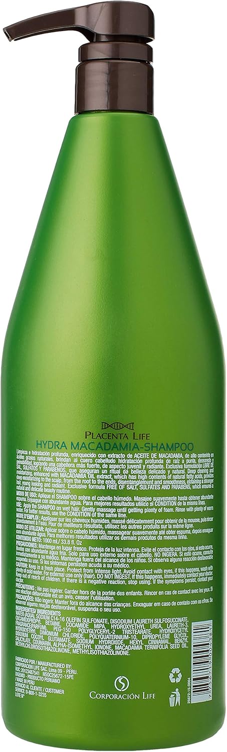 Shampoo Hidratante Macadamia Placent Life | 1000ml | Hidratación profunda para cabello seco y opaco